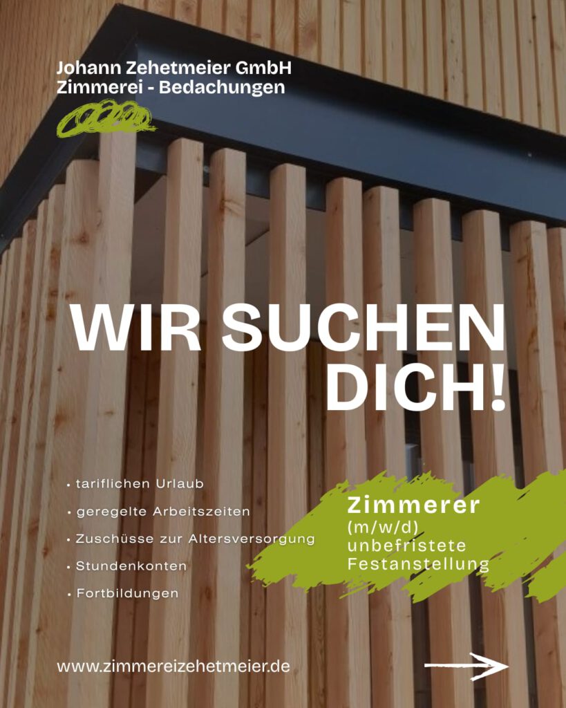 Die Zimmerei Zehetmeier aus Bad Wiessee verstärkt ihr Team und sucht ab sofort einen Zimmerer (m/w/d) in unbefristeter Festanstellung. Als etabliertes Familienunternehmen steht Zehetmeier seit vielen Jahren für hochwertiges Handwerk, moderne Technik und spannende Projekte – von anspruchsvollen Dachkonstruktionen bis hin zu besonderen Fassadenlösungen und Denkmalobjekten. Das erwartet Dich: Tariflicher Urlaub Geregelte Arbeitszeiten Zuschüsse zur […]
